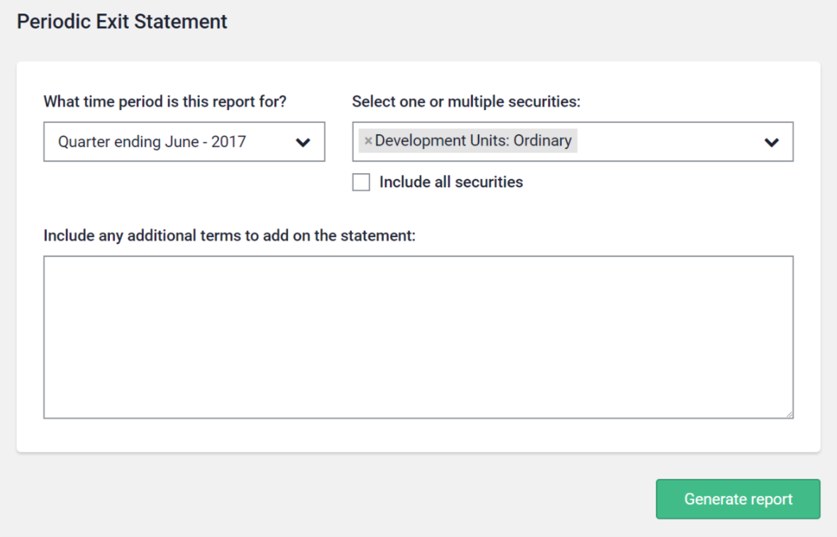 - From the menu, go to Fund admin and click Periodic Exit Statements. Note that this menu item is only available if for issuers who have unit trust securities.
